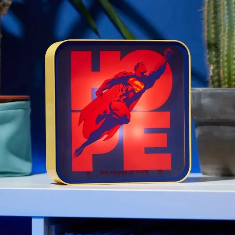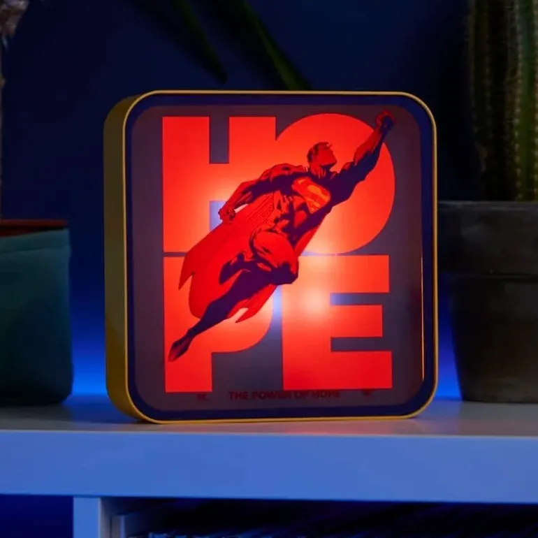 Descubre la lámpara acrílica de Superman, un producto con licencia oficial de DC Comics fabricado por Numskull. Este artículo de decoración mide 22 x 21 x 8 cm y está diseñado para iluminar cualquier espacio con estilo y carácter. La pieza central es un vibrante diseño en acrílico que muestra a Superman en vuelo, acompañado de las palabras ‘HOPE’, evocando el poder de la esperanza.