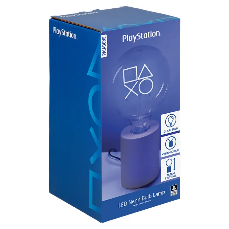 La lámpara cuenta con una bombilla de vidrio que proyecta los símbolos emblemáticos de los controles de PlayStation: cuadrado, triángulo, círculo y cruz, en un brillante color azul. La base de cerámica proporciona un toque sobrio y elegante a la vez que asegura estabilidad.