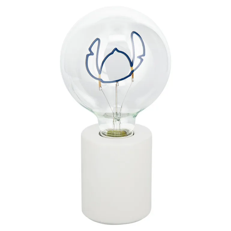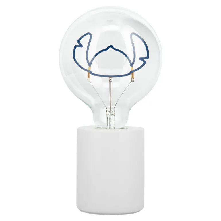 La bombilla está hecha de vidrio transparente que permite ver el encantador contorno del personaje, que brilla con un resaltante color azul neón cuando está encendida. La base de la lámpara es de cerámica de color blanco, ofreciendo un soporte robusto y un contraste perfecto con la bombilla iluminada.