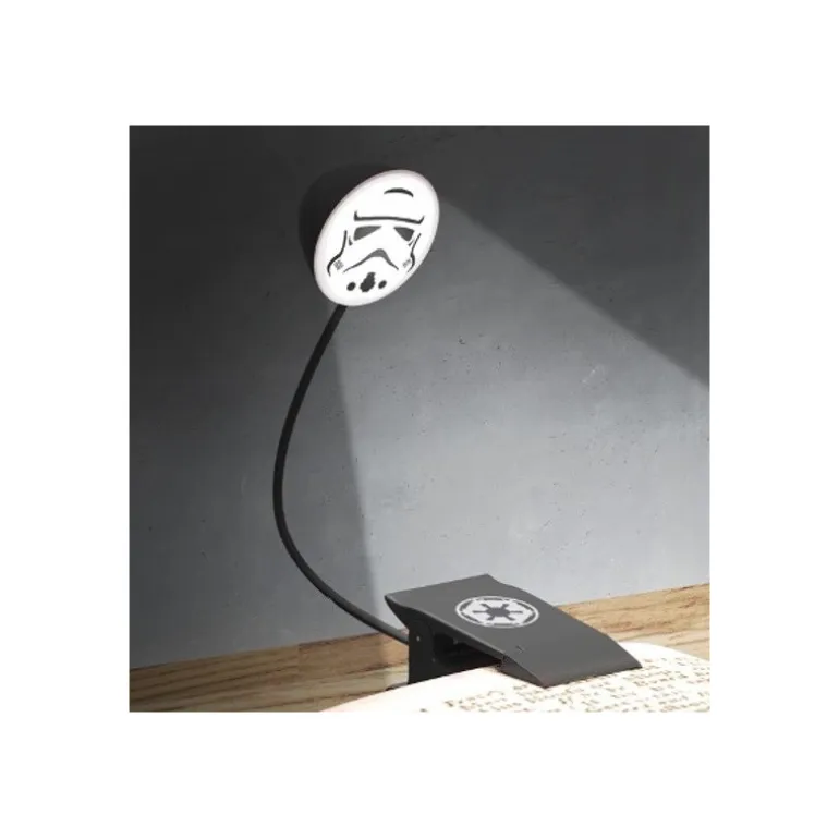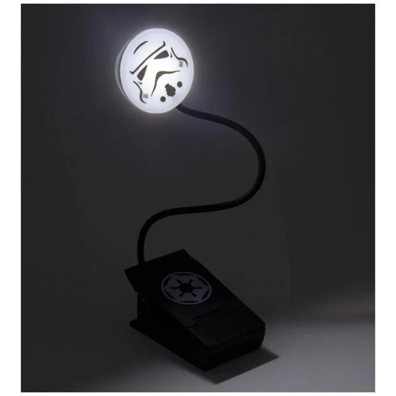 Se trata de una de esas pequeñas lamparas con pinza para leer de manera individual, la puedes colocar directamente en el libro o revista que estés leyendo sin molestar a nadie porque es muy focal y al tener el pie de alambre puedes apuntar en la dirección que tu quieras. Funciona con tres pilas AAA que no vienen incluidas y su diseño es muy molón, en este caso con el casco de un Stormtrooper.