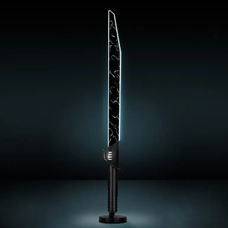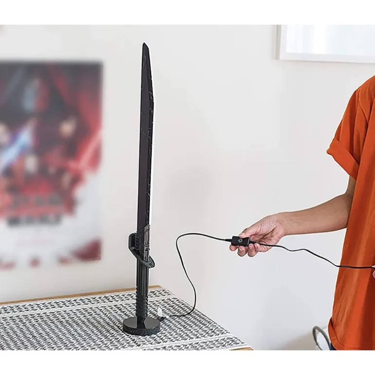 Su estructura en color negro y detalles iluminados le otorgan un toque moderno y sofisticado. De forma vertical, simula con precisión el icónico sable, lo que la convierte en un artículo de colección indispensable. Además, es fácil de usar gracias a su compatibilidad con conexión USB, ideal para escritorios o mesas de noche.