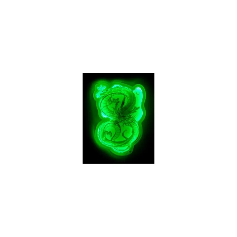 La lámpara presenta una representación detallada de Shenron en tonos verdes y dorados, montada sobre una estructura que permite colgarla como un mural o colocarla en su base soporte. Es ideal para cualquier fan de Dragon Ball que desee personalizar su entorno con un toque exclusivo.