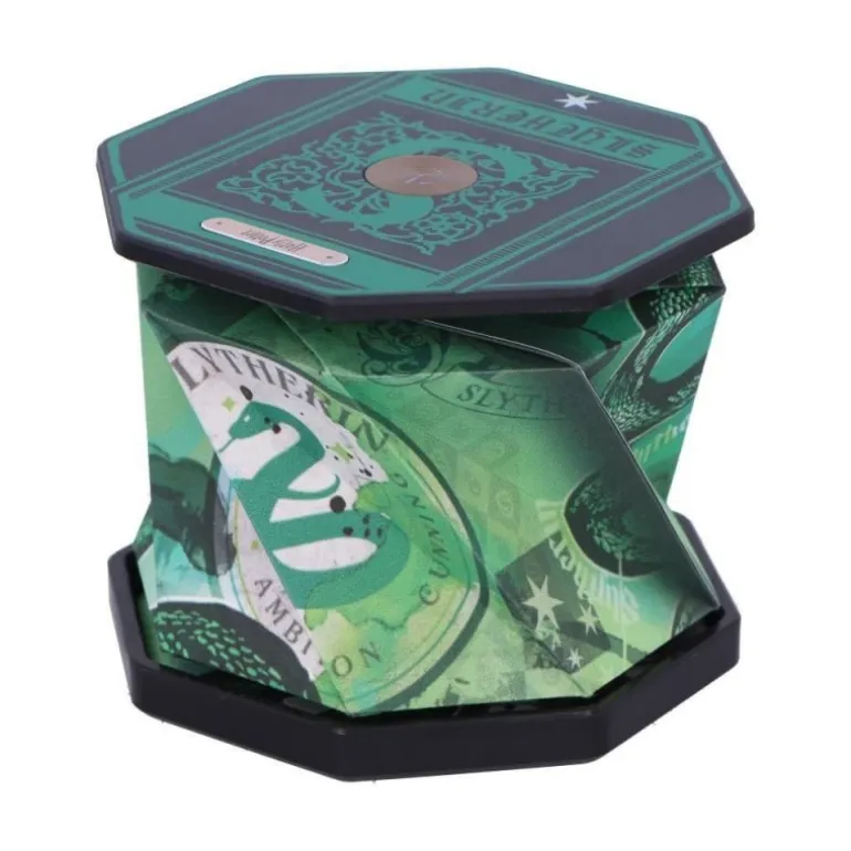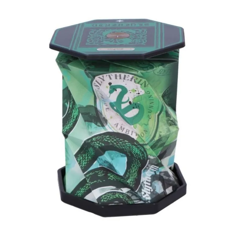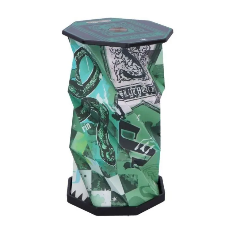 La lámpara presenta un diseño en vibrantes tonos verdes emblemáticos de la casa Slytherin, con detalles del escudo y la serpiente en un patrón geométrico que resalta su estilo único. Su estructura plegable permite un fácil almacenamiento y transporte, convirtiéndola en un regalo original ideal para cualquier entusiasta del mundo mágico de Harry Potter.