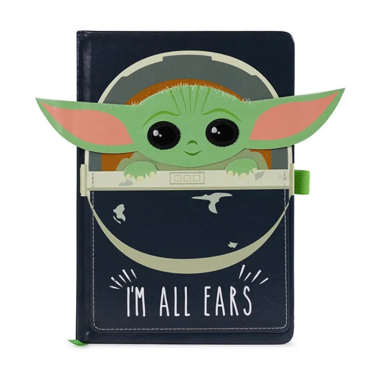Una libreta que si por algo destaca es por su cuidado diseño, con una portada protagonizada por The Child, al que también conocemos como Baby Yoda, en ese capazo flotante tan especial, con su cabeza en relieve y esas orejitas que sobresalen por los lados de la portada. Y no te pierdas los dibujos de Grogu en la parte de detrás.