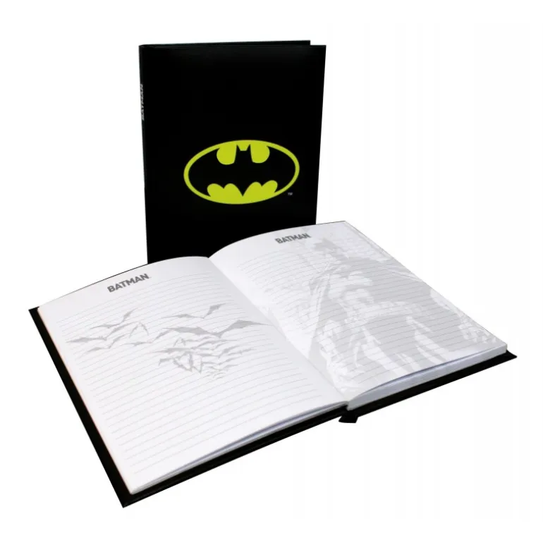 Una elegante libreta A5 con un bonito logo serigrafiado de fondo de Batman. Pero además tiene luz!! Lo has oído bien: si presionas la tapa se encenderá la Batseñal.