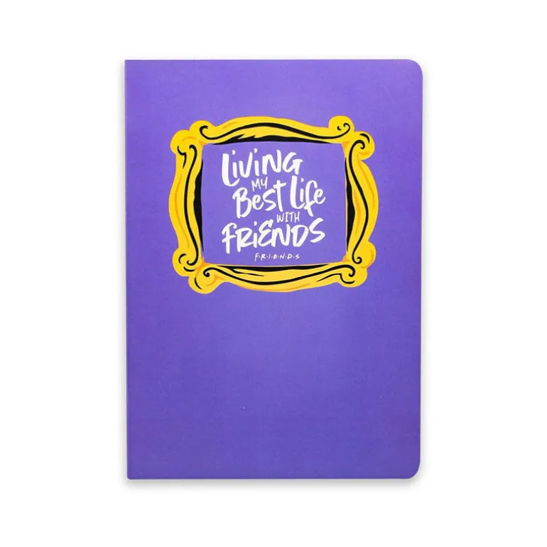 La portada presenta un atractivo diseño en color púrpura, adornado con un marco icónico que resalta la frase «Living my Best Life with Friends«, perfecta para aquellos que valoran la amistad y los buenos momentos. Este detalle no solo la convierte en un accesorio funcional, sino también en una declaración de amor a la serie que ha marcado a generaciones.