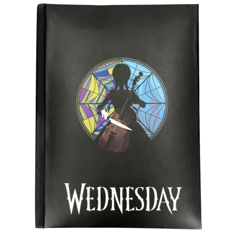 Tiene un gran diseño con una portada con Miércoles Addams como protagonista y con un efecto de rosetón con luz.