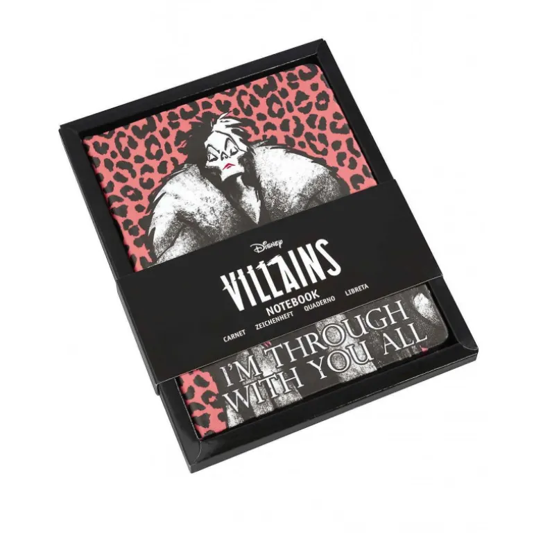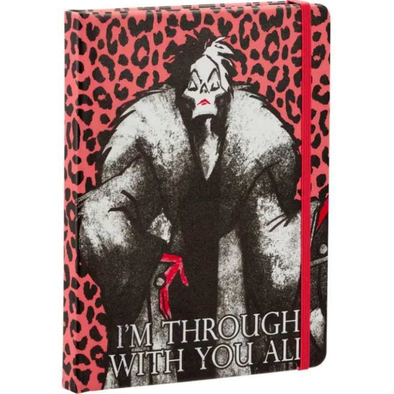 ¡Mira que maravilla de libreta! Es de tamaño aproximadamente A5 (15 cm x 21 cm), de tapa dura, con una elegante goma para mantenerla cerrada tipo Moleskine, y su diseño está basado en una de las villanas más emblemáticas de Disney, la siempre elegante y malvada Cruella de Vil.