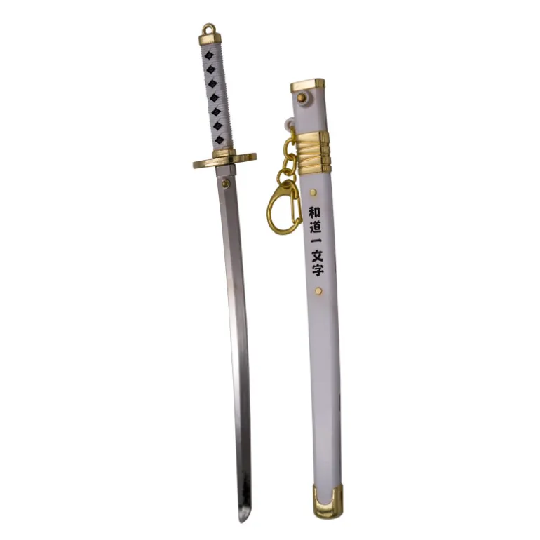 Un espectacular llavero con la forma de la katana Shusui Wado Ichimonji de Zoro como recién sacada de One Piece. Se trata de un pequeño llavero que representa esta katana de Zoro junto a su vaina pero en tamaño mini.