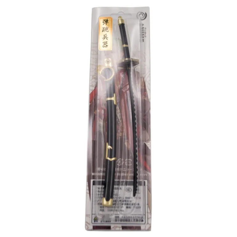 Mide un total de 22 cm y esta fabricada en zinc y acero. Su diseño es una autentica pasada ya que a pesar de su pequeño tamaño no se pierde ni un detalle de esta maravillosa katana Yubashiri de nuestro querido personaje Zoro. Al pulsar el botón de la funda la Katana sale automáticamente con un efecto genial. Fíjate bien en las fotos para ver más detalles como los dibujos que tiene en la hoja y la funda.