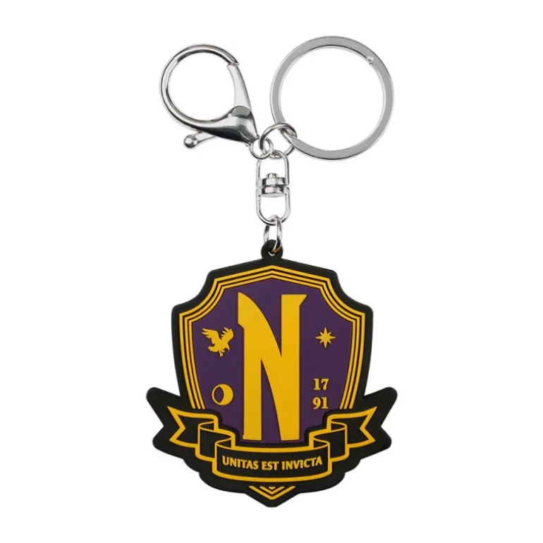 El Llavero Miércoles es un producto de alta calidad fabricado en PVC blando, que presenta el escudo de Nevermore Academy en su diseño. Con un efecto en anverso y reverso, este llavero cuenta con una anilla y gancho de metal que garantizan su durabilidad a lo largo del tiempo. Con unas dimensiones de 0,6 x 6 x 6 cm, este llavero es el regalo perfecto para los fans de Miércoles, ya que es original y útil para el día a día. Su diseño único y su practicidad lo convierten en un accesorio imprescindible para los amantes de la serie. ¡No pierdas la oportunidad de tener un pedazo de Nevermore Academy contigo en todo momento con este fabuloso llavero!