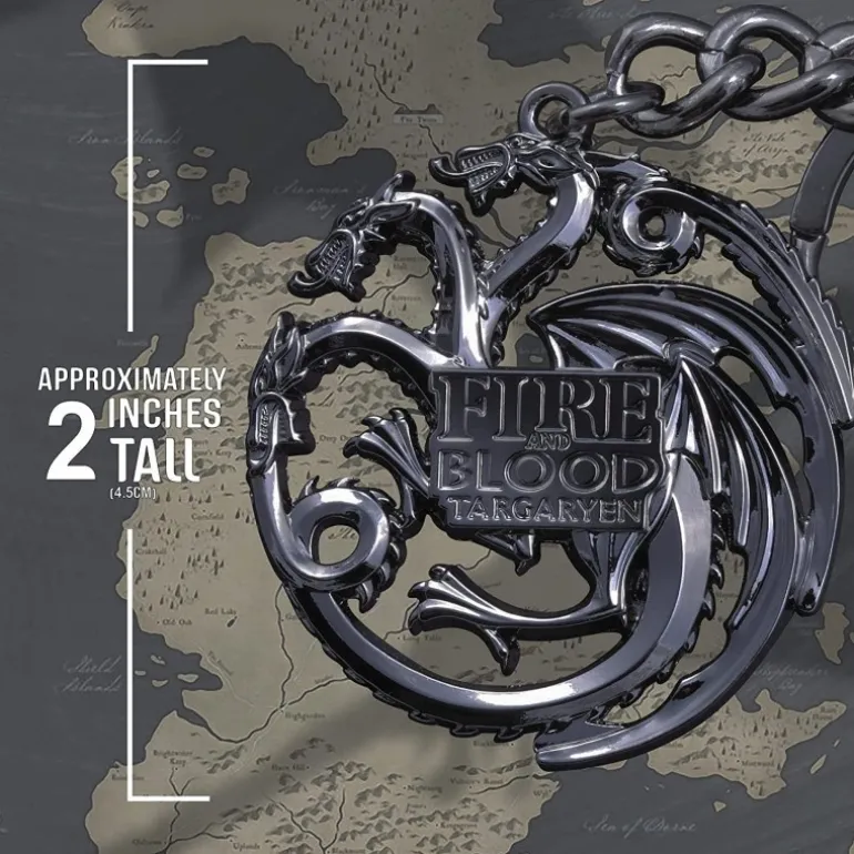 Descubre el llavero Targaryen de Juego de Tronos, una excepcional pieza de colección en un elegante gris cromo. Su diseño intrincado presenta el emblema de la casa Targaryen: un dragón de tres cabezas, acompañado de la icónica frase ‘Fire and Blood’. Con dimensiones de 12,5 cm x 7,7 cm x 2 cm, esta pieza es tanto un tributo a la famosa serie como un complemento práctico para tus llaves. Fabricado por The Noble Collection, garantiza la autenticidad gracias a su licencia oficial. Ideal para coleccionistas y apasionados de la saga, este llavero es un regalo perfecto para quienes desean llevar una parte de Westeros consigo.