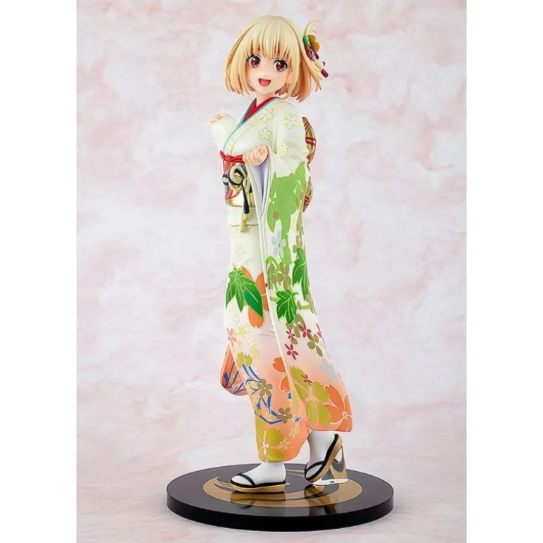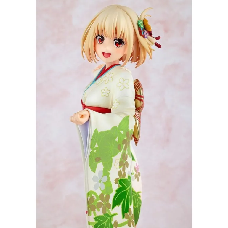Descubre la impresionante estatua de Chisato Nishikigi del aclamado anime Lycoris Recoil. Esta figura a escala 1/7 captura a Chisato con un haregi tradicional vibrante, lleno de colores y detalles florales. La estatuilla mide aproximadamente 23 cm, fabricada en PVC de alta calidad por Kadokawa.