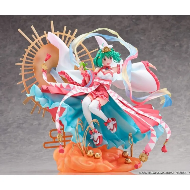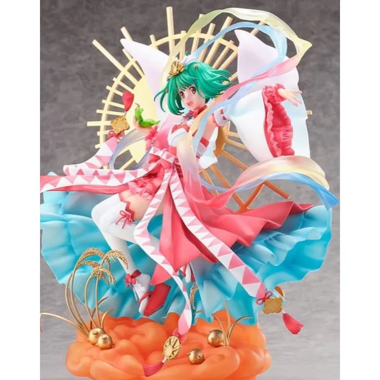 Descubre la exquisita estatua de Ranka Lee de Macross Frontier en su versión Amaterasu. Esta magnífica figura de PVC a escala 1/7 impresiona con sus 29,8 cm de altura y su vibrante paleta de colores que captura la esencia de la serie. Ranka Lee se muestra en una pose dinámica, con su característico cabello verde y un atuendo detallado en tonos rojos, blancos y rosas. La escultura se acompaña de un intrincado fondo dorado que emula un sol radiante, mientras luces y cintas danzan a su alrededor, añadiendo un toque etéreo.
