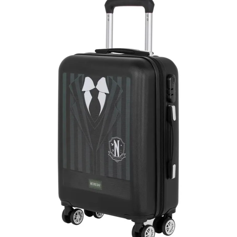 Una preciosidad de maleta con ruedas, elegante, espaciosa y sobretodo con un diseño espectacular, que no dejará indiferente a nadie que lo ve, basado en la nueva adaptación del clásico de la Familia Addams de Netflix: Miércoles.
