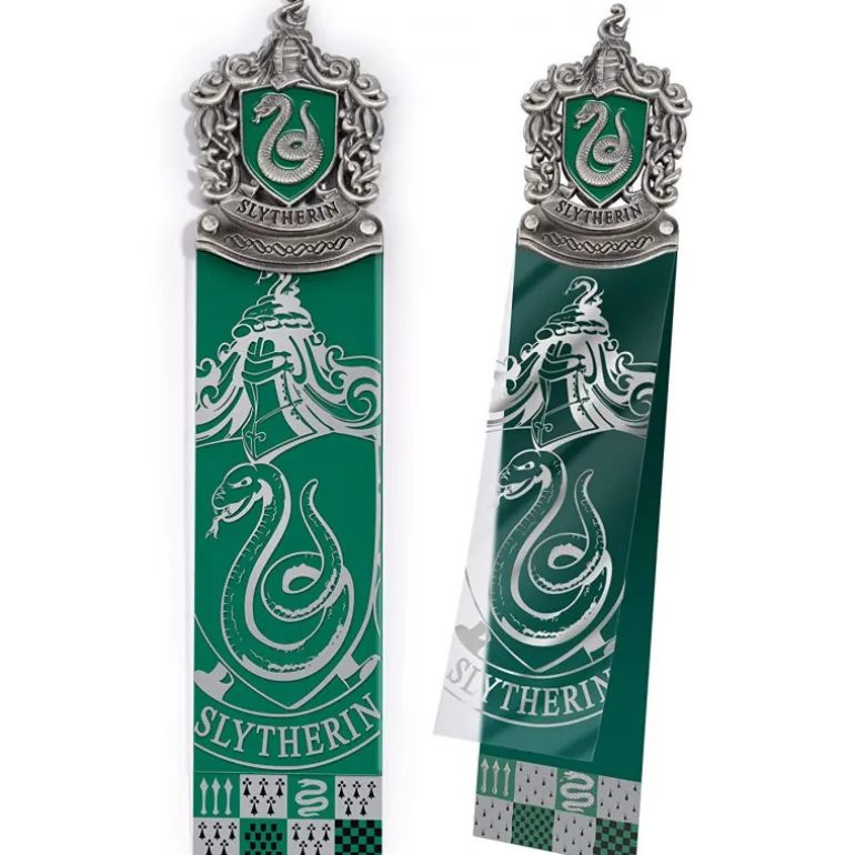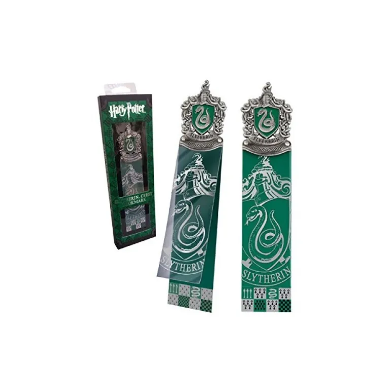 Están realizados en PVC con un escudo metálico de Slytherin, una de las cuatro casas de Hogwarts, con todos los pequeños detalles de este escudo de armas y esa serpiente tan característica que representa a la casa. Y fíjate en sus fantásticos acabados, en color plata envejecida y con el escudo en relieve y coloreado. Un punto de libro que mide 24 x 8 cm y es un producto manufacturado por el prestigioso fabricante The Noble Collection.