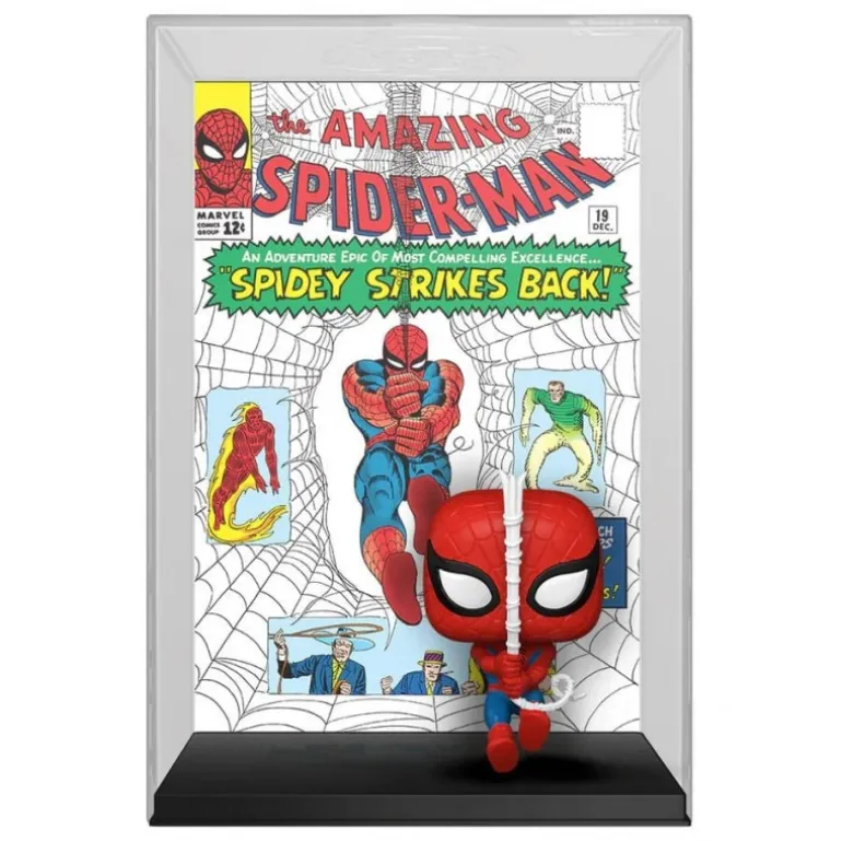 Descubre la figura de vinilo de Spider-Man de 9 cm de la prestigiosa línea ‘POP!’ de Funko. Este artículo único presenta el clásico diseño del cómic The Amazing Spider-Man #19. La figura capta a Spider-Man en una dinámica pose de acción, destacándose sobre un fondo que reproduce la portada icónica del cómic.