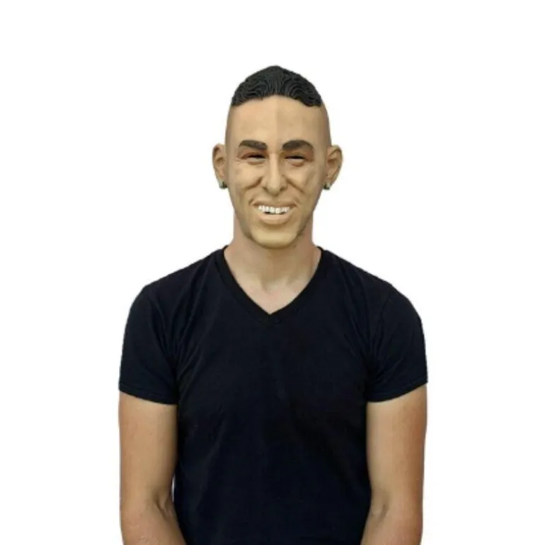 La máscara muestra un color piel natural con detalles como cejas definidas y cabello con textura ondulada en color oscuro. Además, los rasgos faciales están cuidadosamente diseñados para ofrecer una apariencia auténtica y realista.