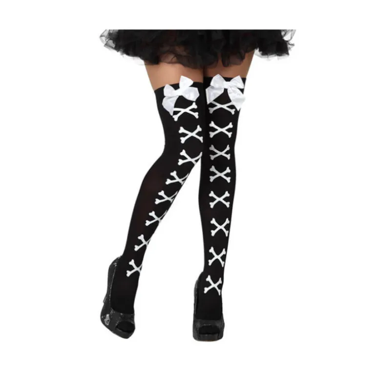 Medias liga de Pirata negras con huesos y lazos blancos. Perfectas para el disfraz de Esqueleto para Halloween.