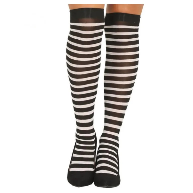 Medias Negras con Rayas Blancas. Perfecto en fiestas del terror como Halloween. Ideal para nuestros disfraces de Presa, Presidiaria, Reclusa o Prisionera. ¡Compra en un e-commerce como y apoya el comercio español!