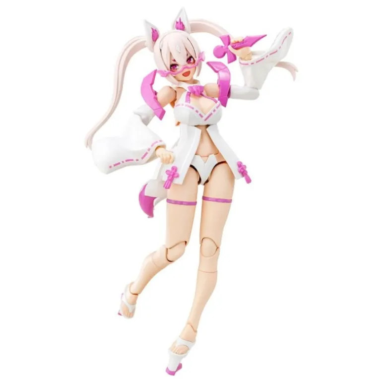 La figura presenta un esquema de colores vibrantes en tonos blanco y rosa, con detalles en piezas articuladas para poses dinámicas. El personaje está adornado con orejas de zorro y accesorios únicos, incluyendo una armadura blanca con detalles morados y rojos. Las imágenes muestran diferentes configuraciones, desde poses de acción hasta posiciones relajadas, debida a su tecnología de ensamblaje Snap-Fit, que facilita el montaje sin necesidad de herramientas adicionales.