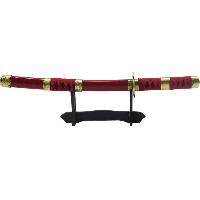 Es una réplica de la espada Sandai Kitetsu que lleva Zoro durante los episodios que mide un total de 45 cm y con la hoja de acero sin filo negra con dentado satinado, mango con encordado burdeos.