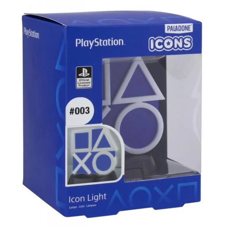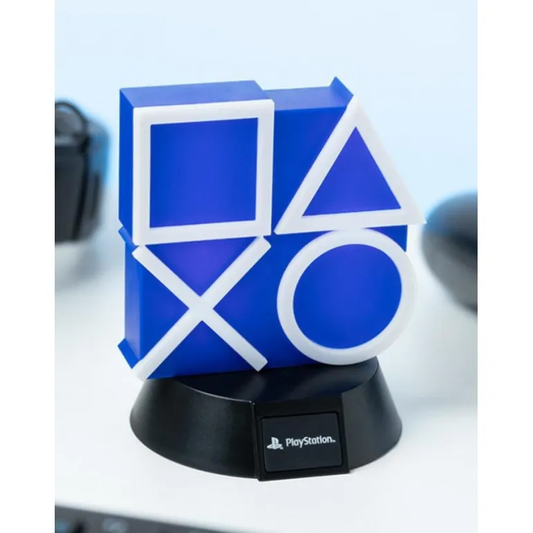 Esta espectacular lámpara reproduce en 3D los cuatro símbolos clásicos de los botones del mando de la Play: la equis, el círculo, el triángulo, y el cuadrado, en color blanco sobre un fondo azul y sobre una pequeña peana con el logo oficial de PlayStation.
