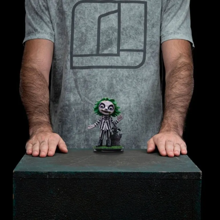 Descubre la Minifigura de Beetlejuice de la línea Mini Co. de Iron Studios, una pieza coleccionable que captura la esencia del icónico personaje. Fabricada en PVC, esta figura de 14 cm muestra a Beetlejuice con su característico traje a rayas en blanco y negro. Su expresión inquietante y cabello verde aportan a su diseño una autenticidad excepcional. Acompañando su figura, aparece una lápida con detalles espectrales, sobre una base simulando césped. Este producto con licencia oficial es perfecto para añadir originalidad a tu colección y viene presentado en una caja con ventana, ideal para exhibición. Un regalo incomparable para los aficionados al cine de Tim Burton o un capricho personal que transformará cualquier estantería.