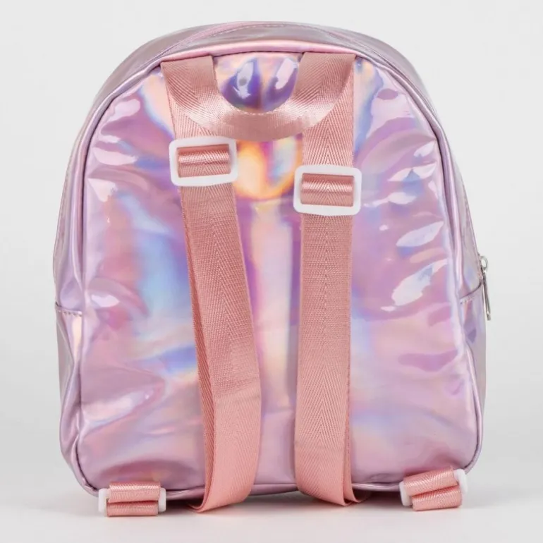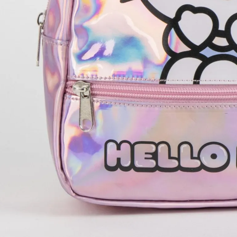 Descubre la mochila casual iridiscente Hello Kitty, un accesorio perfecto para las más pequeñas que desean llevar la magia y el encanto de Hello Kitty a todas partes. Esta mochila está elaborada en 100% PU, lo que le confiere una apariencia moderna y resistente. Su diseño en color rosa iridiscente refleja un arco iris de colores cuando es impactado por la luz, haciendo que cada ángulo sea espectacular.