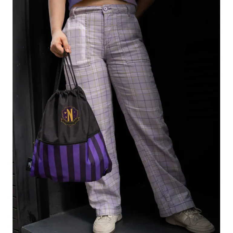 Una mochilita tipo saco de los que se cierran con cuerdas, que no dejará indiferente a nadie que lo ve, basado en la nueva adaptación del clásico de la Familia Addams de Netflix: Miércoles.