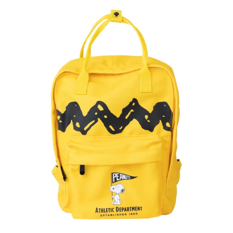 La Mochila Everyday Snoopy es un producto que destaca por su practicidad y su divertido diseño, que sin duda capturará la atención de los entusiastas de Snoopy. El diseño evoca al eterno jersey de Carlitos en las tiras de Peanuts, con su greca negra sobre un fondo amarillo.