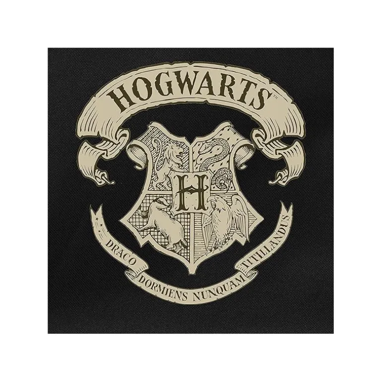 El mochila tiene unas medidas de unos 45x31x19 cm de largo y está fabricada en algodón lavable de muy alta calidad. Con fodo negro y motivos en ocre con el escudo de escuela de Hogwarts .