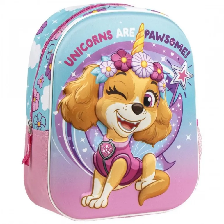 La mochila presenta una imagen en relieve 3D de Skye, el adorable personaje de Paw Patrol, con un diseño vibrante en tonos rosado y azul. La escena muestra a Skye luciendo un unicornio en su frente junto a un letrero que dice «Unicorns are pawsome!», rodeada de estrellas y flores que añaden un toque mágico.