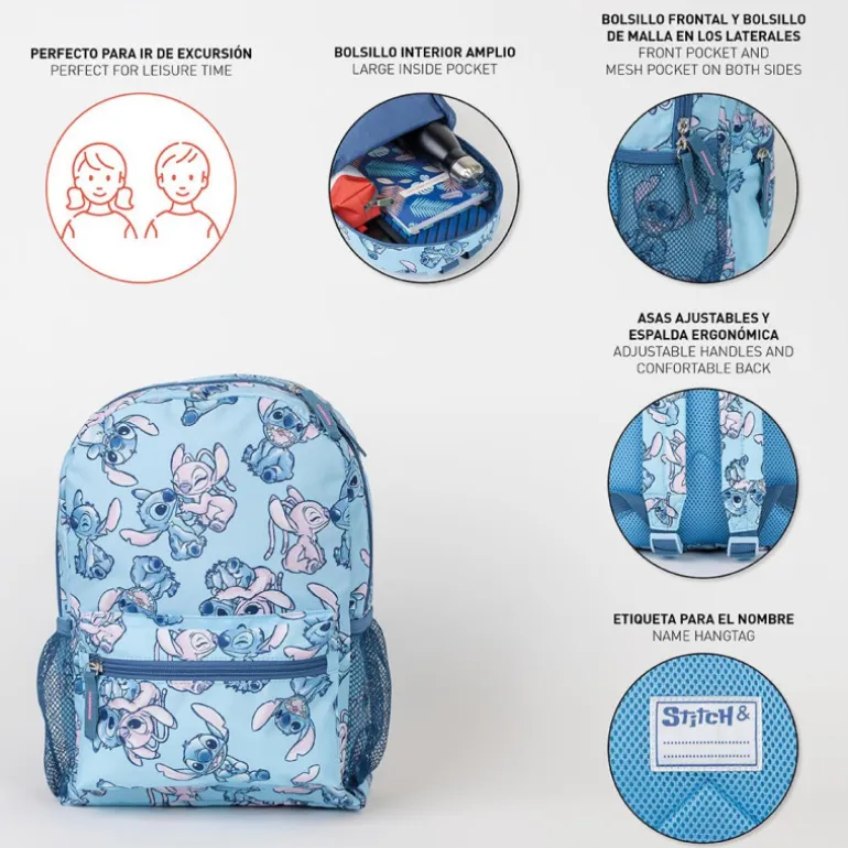 Descubre la mochila infantil ideal para los pequeños aventureros. Esta mochila es de un encantador color azul claro con un vibrante estampado del querido personaje Stitch. Diseñada en un resistente 100% poliéster, garantiza durabilidad y resistencia en el uso diario.