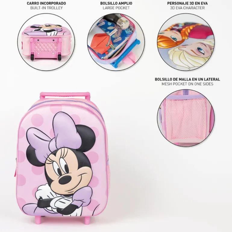 La mochila infantil trolley 3D Minnie es el accesorio perfecto para los más pequeños que desean llevar consigo todas sus pertenencias de manera cómoda y segura. Fabricada con un 67% de poliéster y un 33% de EVA, esta mochila garantiza resistencia y durabilidad, acompañando a los niños en todas sus aventuras.