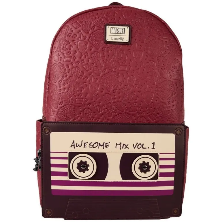Descubre la mochila LOUNGEFLY Groot, inspirada en los Guardianes de la Galaxia. Este artículo con licencia oficial combina funcionalidad y estilo de una manera única. La mochila presenta un vibrante color burdeos con un diseño en relieve que representa a tus personajes favoritos. El bolsillo frontal imita una cinta de casete, con la inscripción ‘Awesome Mix Vol. 1’, un guiño perfecto a la banda sonora de la película.