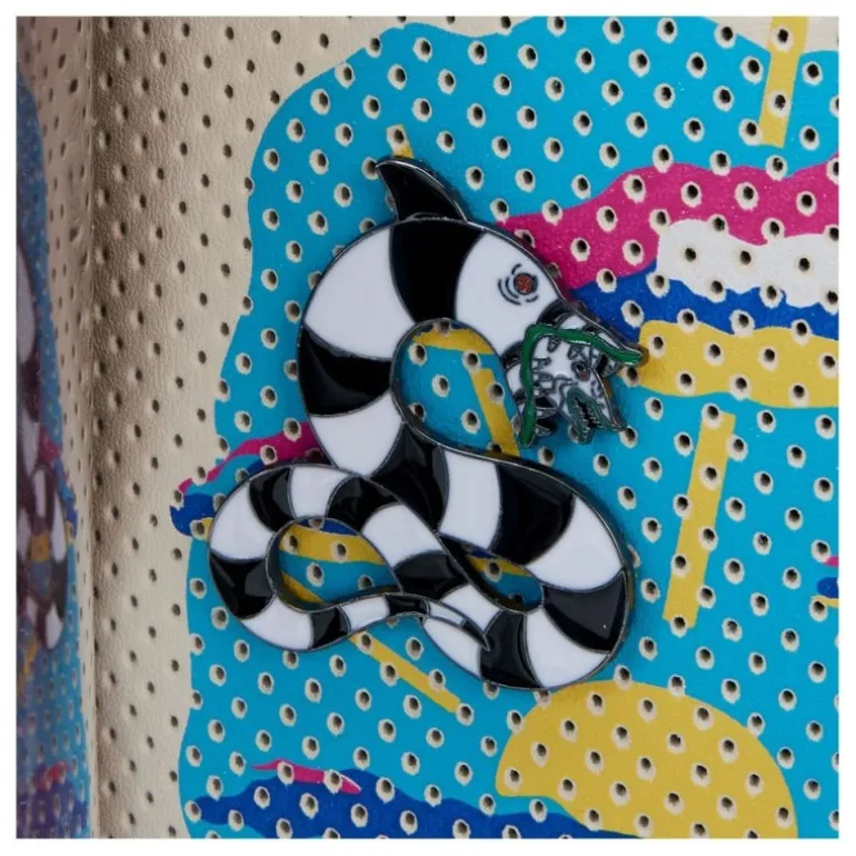 En su interior, encontrarás un forro decorado con elementos icónicos de Beetlejuice, desde espirales hipnóticas hasta su nombre que resuena con eco. La mochila también incluye un pin exclusivo del personaje al menos visible en su exterior, haciendo de esta pieza un verdadero tesoro de colección para los fans de la saga.