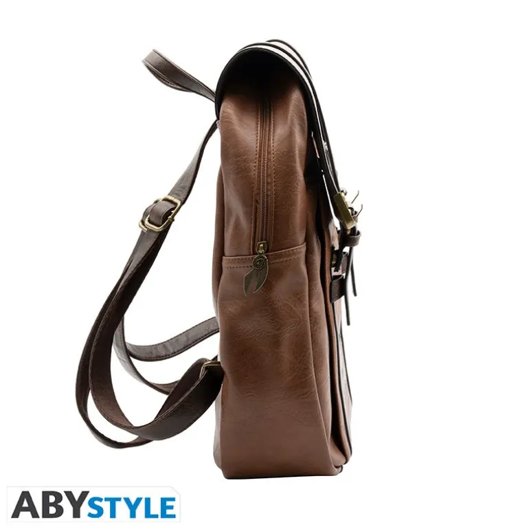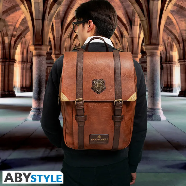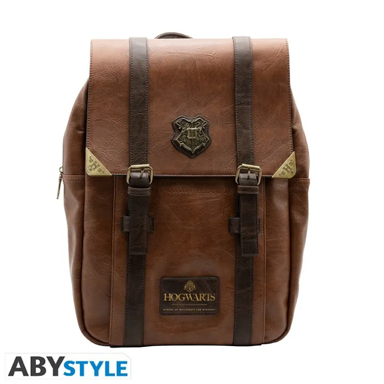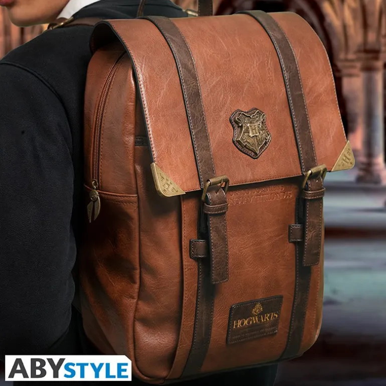 Esta mochila Premium de Hogwarts Harry Potter fabricada por ABYstyle es una pieza única que destaca por sus pequeñas piezas de metal estilizadas, elementos con dorado y otros grabados en el material de la mochila.