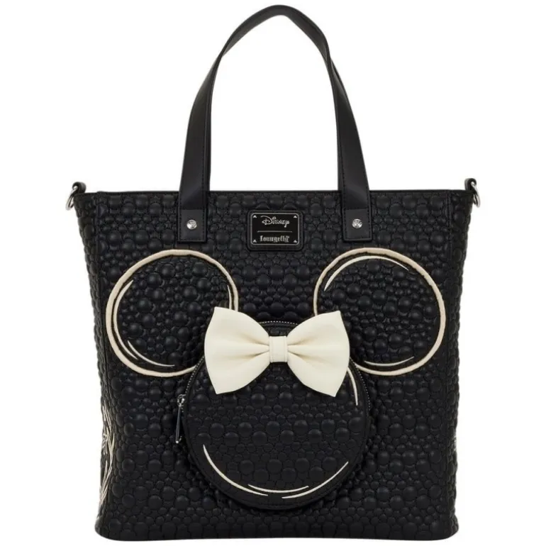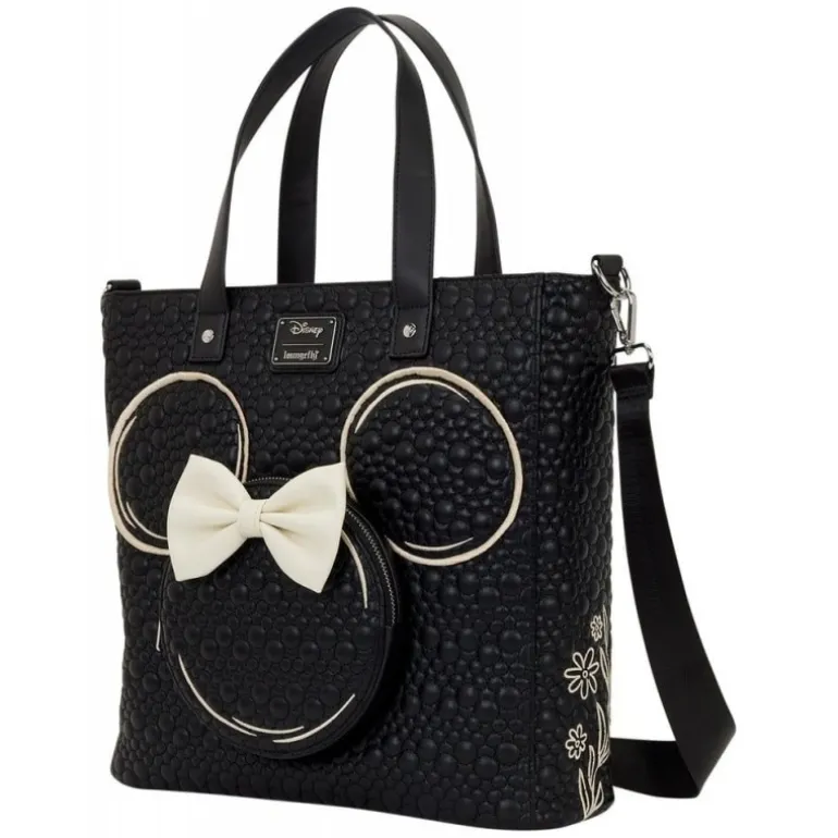 Las dimensiones de 30 x 35 x 11 cm la hacen perfecta para llevar todo lo que necesites. Destaca el detalle de las orejas de Minnie con un lazo blanco sobre una base negra texturizada que resalta el encanto del personaje y aporta un toque distintivo.