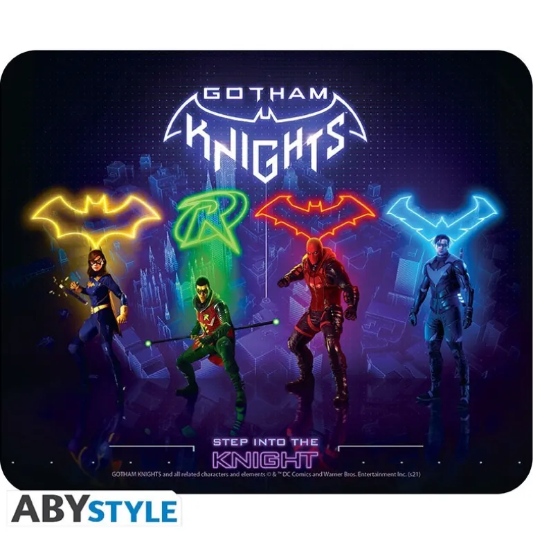 Descubre el mousepad flexible de Gotham Knights, un producto con licencia oficial de DC Comics. Este mousepad destaca por su diseño vibrante que presenta a los icónicos personajes de Gotham, incluyendo a Batgirl, Robin, Red Hood y Nightwing, junto a sus logotipos iluminados en colores brillantes. Su superficie suave favorece un deslizamiento preciso, ideal para largas sesiones de ordenador.