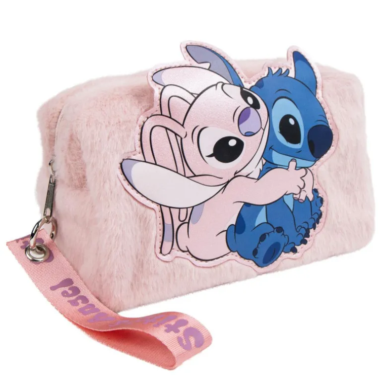 Una de las características más llamativas de este neceser es su superficie cubierta de un suave pelito rosa, que no solo es visualmente atractivo, sino que también aporta una textura agradable al tacto. Esta elección de diseño proporciona un toque lúdico y distintivo, convirtiendo un artículo cotidiano en una pieza que refleja estilo y personalidad. La presencia de los icónicos personajes de Disney, Angel y Stitch, añade un componente emocional, evocando recuerdos entrañables y una conexión con el universo de Disney que seguro resonará con los fans de todas las edades.