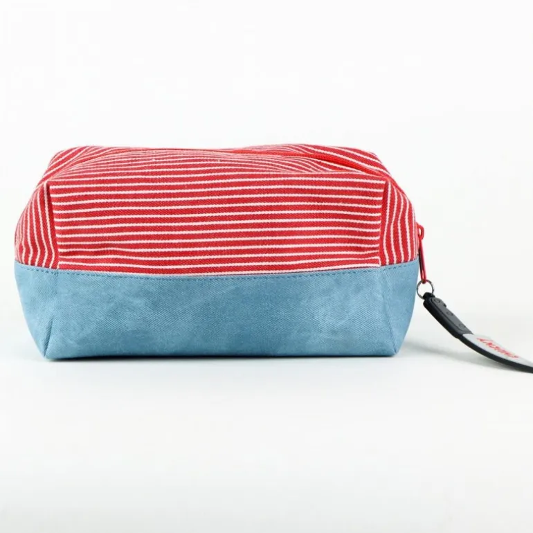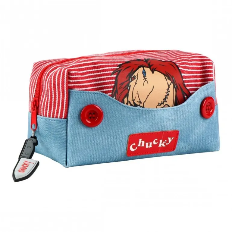 Este neceser de aseo de viaje Chucky es ideal para los fanáticos del terror y el cine clásico. Confeccionado en un 50% de PVC y 50% de algodón, combina resistencia y estilo. El diseño presenta llamativas rayas rojas y blancas en la parte superior, complementadas con una base azul denim. Detalles distintivos como los botones rojos y el parche frontal con la marca ‘Chucky’ lo hacen único. Destaca la imagen del icónico personaje Chucky en el frontal, evocando su famosa apariencia de muñeco diabólico. Un toque especial es el tirador del cierre en forma de cuchillo, añadiendo un guiño siniestro al diseño. Este neceser no solo es práctico para guardar tus productos de higiene personal en viajes, sino que también es un artículo coleccionable para los aficionados al personaje.