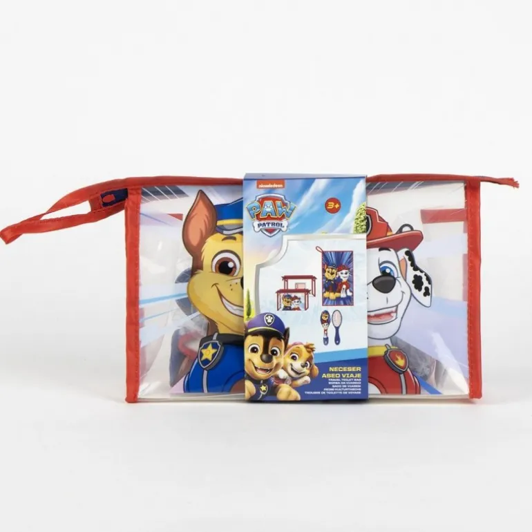 Este encantador neceser de viaje está diseñado pensando en los más pequeños, decorado con los entrañables personajes de Paw Patrol. Fabricado en un resistente plástico transparente con ribetes rojos, permite ver el contenido fácilmente y aporta un toque de diversión a la rutina de aseo de tu niño. En su interior, encontrarás una toalla suave decorada con vibrantes imágenes de los personajes Chase y Marshall sobre un fondo azul estrellado, perfecta para secarse después de un refrescante baño.