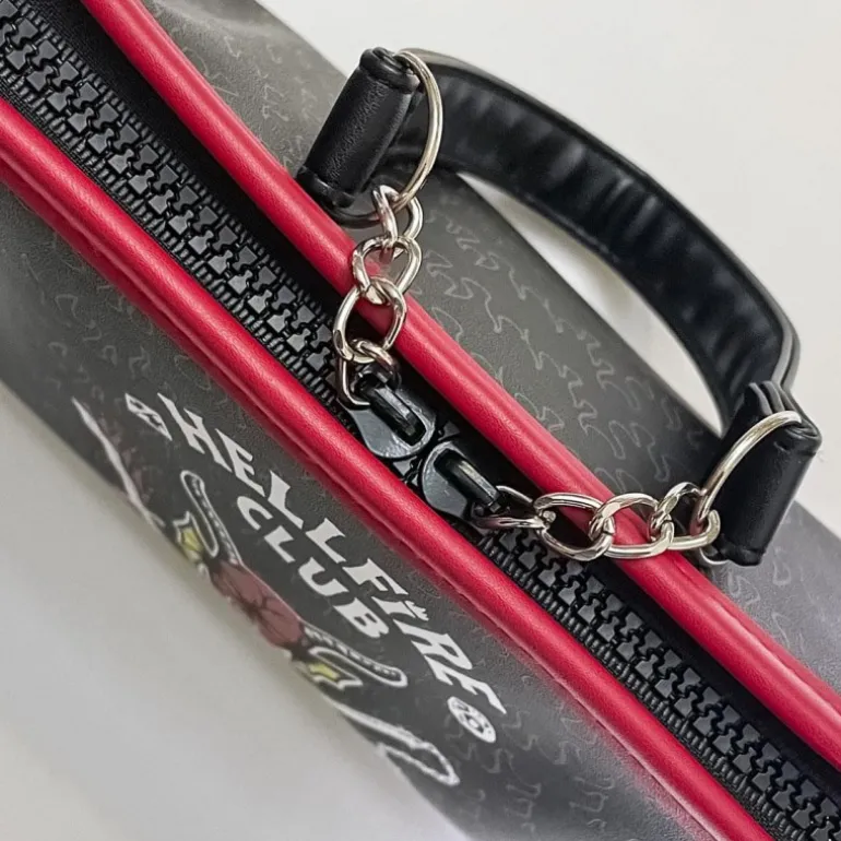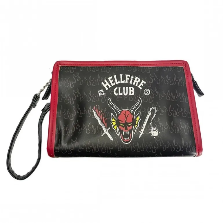 Este neceser de viaje inspirado en Stranger Things es perfecto para los fans del Hellfire Club. Confeccionado en 100% poliuretano, presenta un diseño en color negro con detalles en rojo. El frontal está adornado con el emblemático logotipo del Hellfire Club, incluyendo llamas y un demonio central, que aporta un estilo único y audaz. Además, cuenta con un cierre de cremallera seguro y detalles metálicos en la correa que facilitan su transporte. Su tamaño es ideal para llevar todo lo necesario en tus viajes o para el día a día.