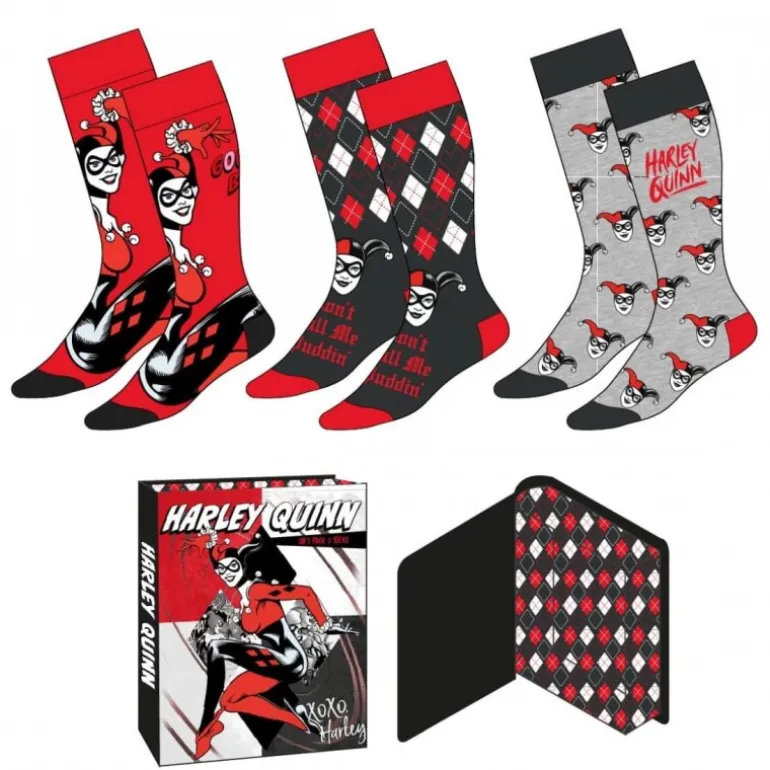 Este pack de calcetines de Harley Quinn es perfecto para los verdaderos fans del universo DC. Incluye tres pares de calcetines con un diseño único y atrevido, predominando los colores rojo, negro y gris. Cada par muestra a Harley Quinn con diferentes expresiones y estilos, haciendo cada calcetín una pieza de colección ideal. Son talla única (TU) adecuada para números 36 a 43, adaptándose cómodamente a distintos tamaños. Están confeccionados con un 70% de algodón, 28% de poliamida y 2% de elastano, garantizando suavidad y elasticidad.