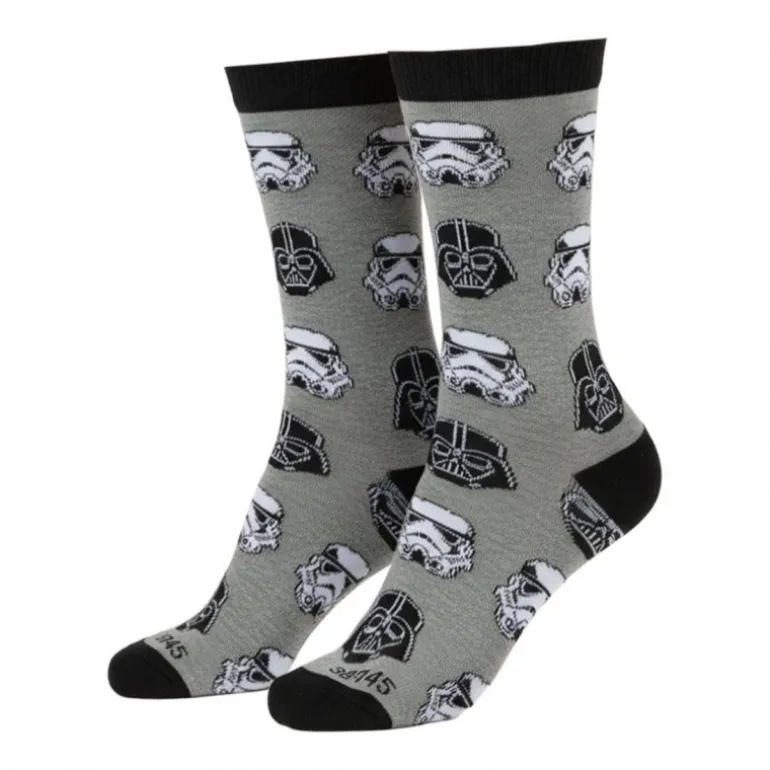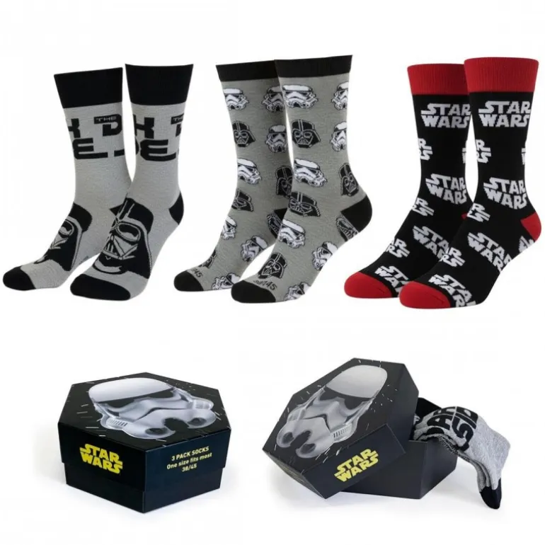 Los calcetines presentan diferentes estampados: uno exhibe al temido Darth Vader en tono gris y negro, otro está decorado con cascos de Stormtroopers y Darth Vader en diversas posturas sobre un fondo gris, y el tercero se distingue por el logotipo de Star Wars sobre fondo negro con detalles en rojo.