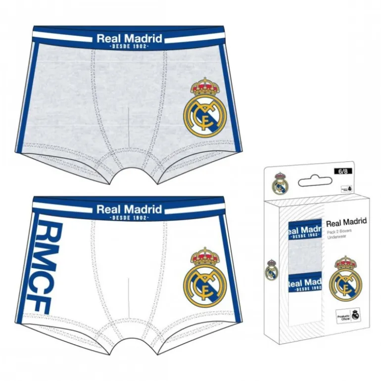 Descubre el Pack de Boxers Real Madrid, un imprescindible para los pequeños aficionados del equipo. Cada pack incluye dos boxers de suave jersey 100% algodón, garantizando comodidad y transpirabilidad durante todo el día. Los diseños son vistosos y muestran orgullosamente el escudo del Real Madrid, con el clásico texto ‘Desde 1902’. Este pack viene en dos combinaciones de colores: uno en blanco con el escudo y otro en gris con líneas azules, ideal para cualquier conjunto de ropa interior. Perfectos para niños apasionados por el fútbol, estos boxers están disponibles en tallas de 4 a 10 años. Consulta nuestra Guía de tallas para asegurarte de elegir la talla perfecta.