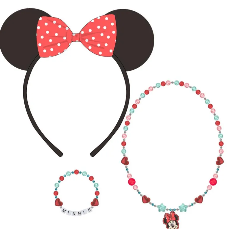 La diadema presenta las icónicas orejas de Minnie, adornadas con un lazo rojo con lunares blancos que añade un toque juguetón. Está fabricada en multicomposición, garantizando comodidad y un ajuste perfecto para todas las edades. El collar está diseñado con cuentas de diferentes colores, incluyendo tonos rosados y azulados, así como pequeños corazones, y cuenta con un colgante de la adorable Minnie. La pulsera, también decorada con cuentas y un pequeño detalle que dice «MINNIE», es el complemento ideal para completar el look.