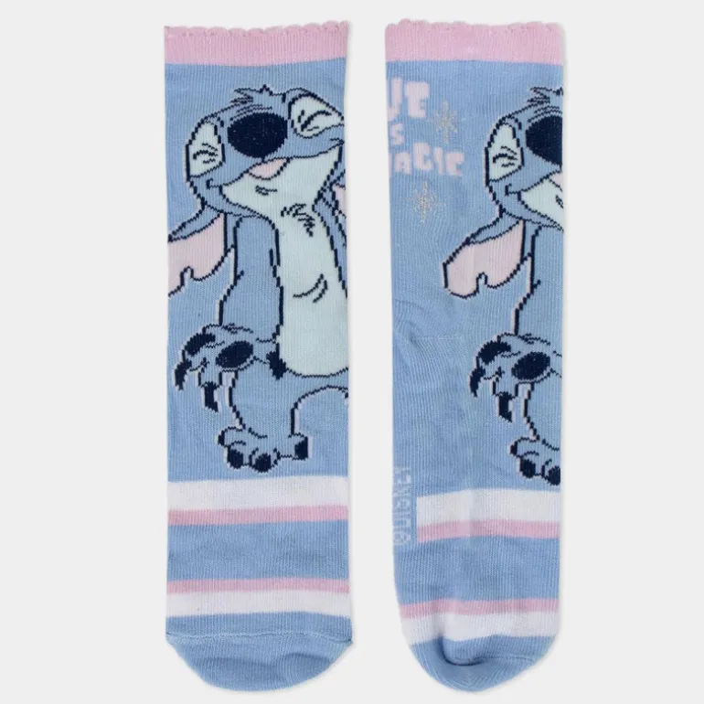 Los calcetines están disponibles en dos tallas: T.27/30 y T.35/38, lo que los convierte en una opción perfecta tanto para los más pequeños como para los más grandes. Cada par presenta detalles únicos, como el simpático Stitch en diferentes poses, acompañado de mensajes como «Love is Magic», que añaden un toque de encanto a cualquier atuendo. Además, están presentados en un práctico tubo decorativo que no solo los protege, sino que también se convierte en un bonito elemento decorativo.
