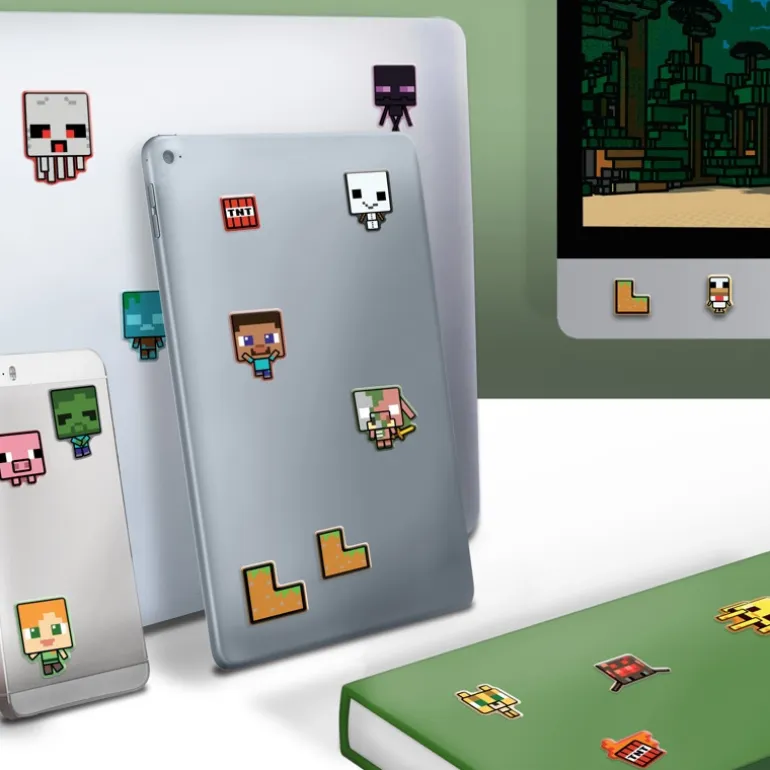 El paquete incluye una variedad de pegatinas que representan personajes icónicos y elementos del juego, como animales y bloques, todo en un formato pixelado característico de Minecraft. Los vinilos tienen un diseño acolchado que les da una apariencia y textura únicas, ideales para dar vida a tus dispositivos como tablets, móviles y cuadernos.